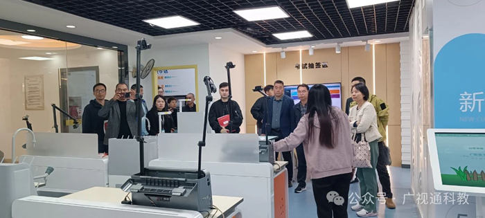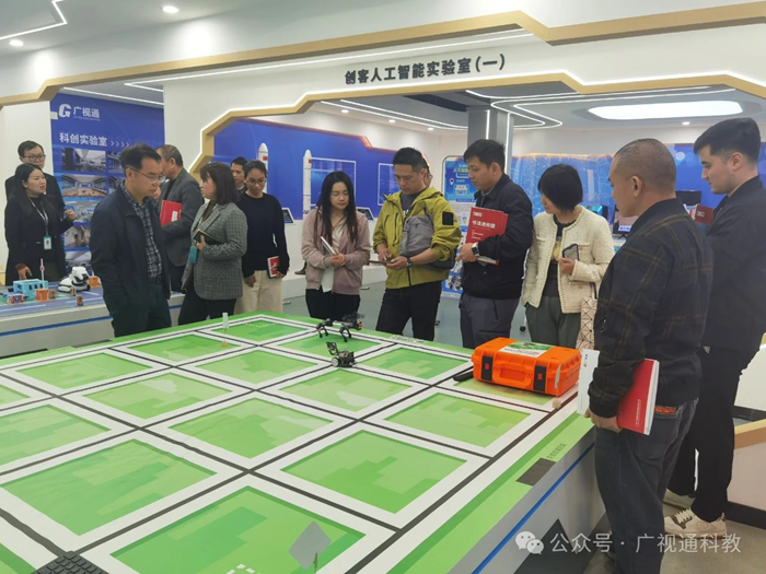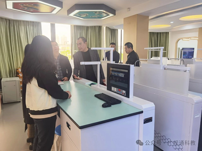 在公司董事長陳登貴的陪同下,來訪領導一行參觀了廣視通創新教育裝備體驗中心的各個展廳,包括智慧書法教室、實驗教學與操作考評系統、創新理化生實驗室、人工智能科創實驗室、數字地理教室等,詳細了解廣視通的發展歷程、企業文化、品牌建設及發展戰略等,并對廣視通的發展給予了充分肯定,期待未來雙方能有更深入的交流與合作。
