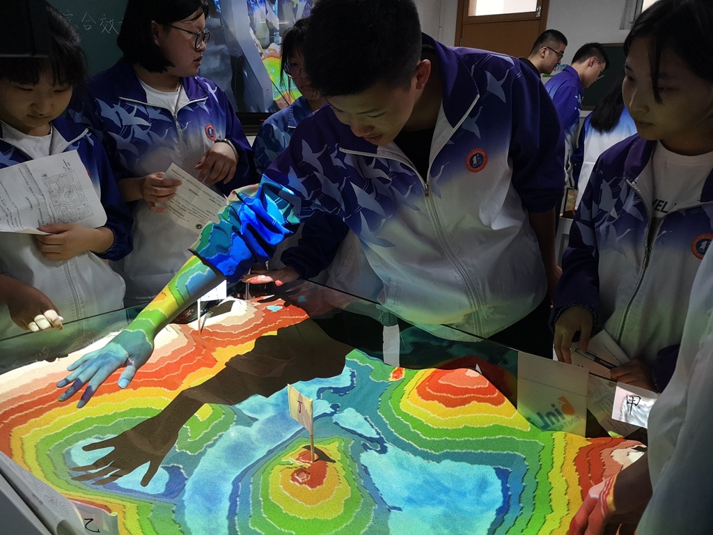 地理AR沙盤結(jié)合了計算機、投影機、體感追蹤設(shè)備,當(dāng)學(xué)生在沙盤中堆砌沙子呈任意形態(tài)時,體感追蹤器會實時測量出下方沙子的高度,投影機會依據(jù)模型高度投射分層設(shè)色圖,進而演示不同地形地貌。隨著學(xué)生移動沙盤內(nèi)的沙子,追蹤器捕捉其形態(tài)變化,投射的色彩和等高線也會發(fā)生相應(yīng)的變化。