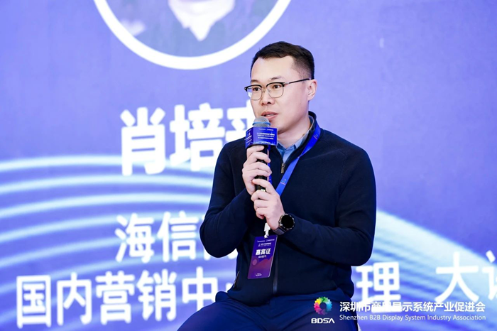 大會現場,海信商用顯示國內營銷中心總經理肖培來受邀參與“大咖對話”環節,與業界領袖共論AI技術深度賦能商顯產業的未來圖景。