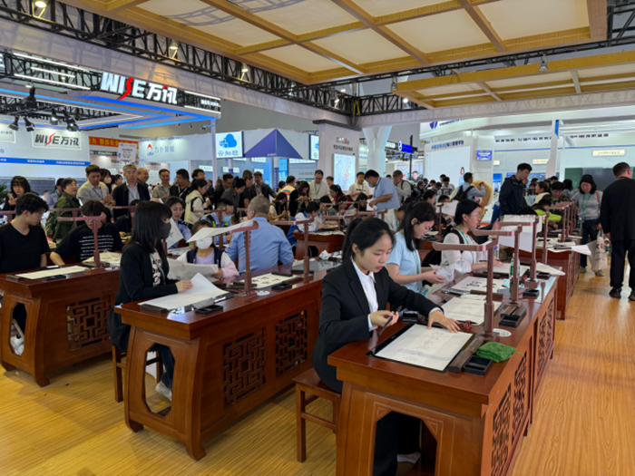 負(fù)責(zé)本次展會(huì)安全的公安警察,以及為展會(huì)提供服務(wù)的志愿者們,在忙碌間隙也被華文眾合展位的熱鬧氛圍吸引而來(lái),紛紛坐下來(lái)體驗(yàn)智慧書(shū)法的魅力。