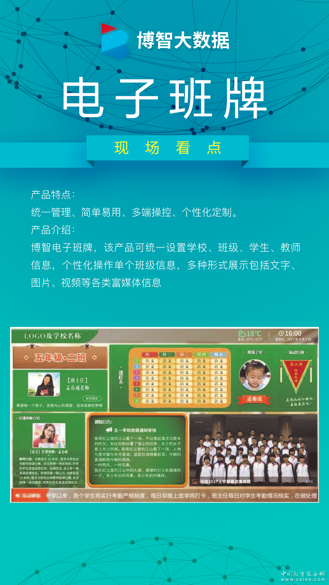 產(chǎn)品詳細(xì)介紹博智電子班牌,該產(chǎn)品可統(tǒng)一設(shè)置學(xué)校、班級(jí)、學(xué)生、教師信息,個(gè)性化操作單個(gè)班級(jí)信息,多種形式展示包括文字、圖片、視頻等各類富媒體信息。