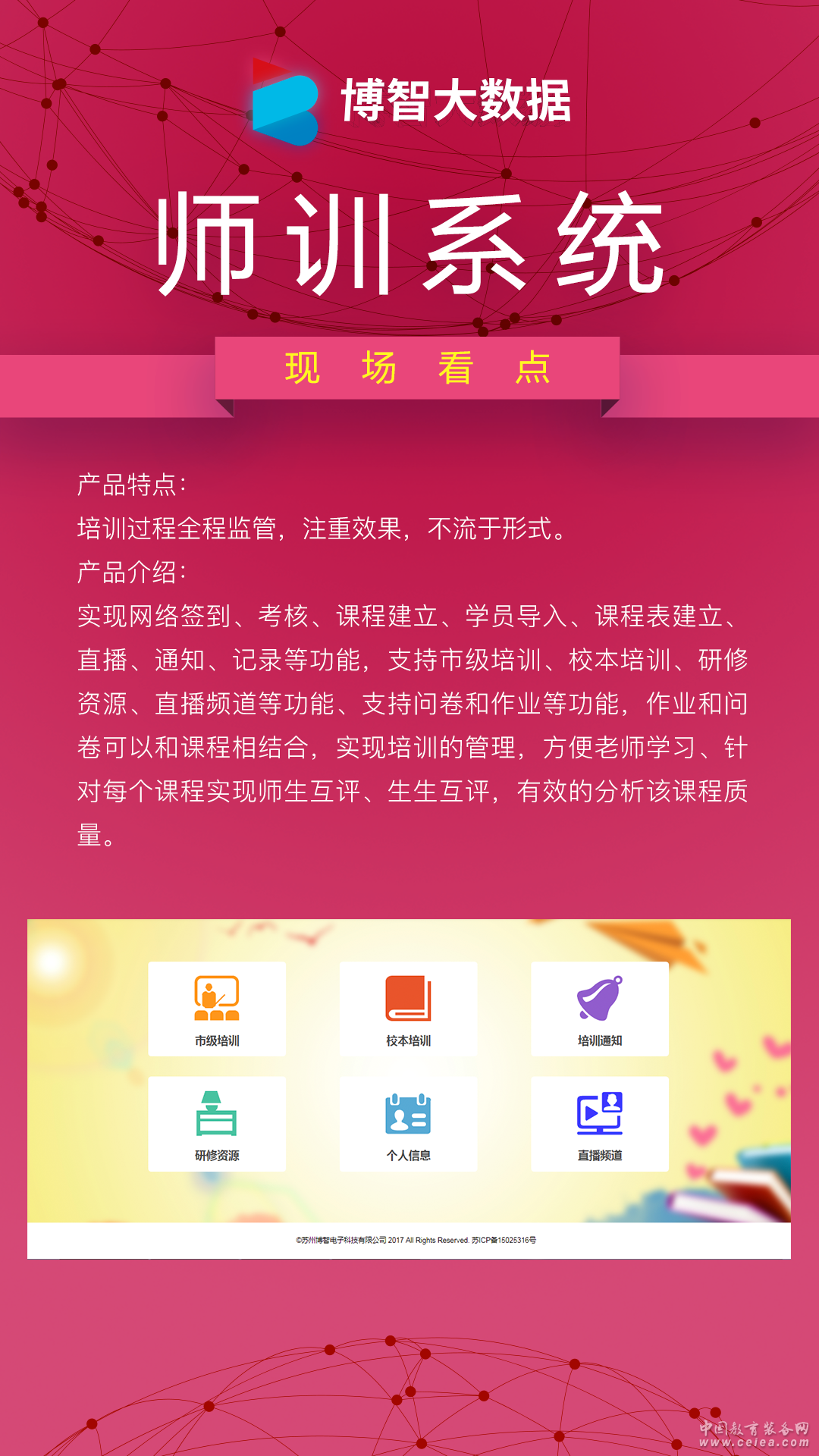 產品詳細介紹實現網絡簽到、考核、課程建立、學員導入、課程表建立、直播、通知、記錄等功能,支持市級培訓、校本培訓、研修資源、直播頻道等功能、支持問卷和作業等功能,作業和問卷可以和課程相結合,實現培訓的管理,方便老師學習、針對每個課程實現師生互評、生生互評,有效的分析該課程質量。