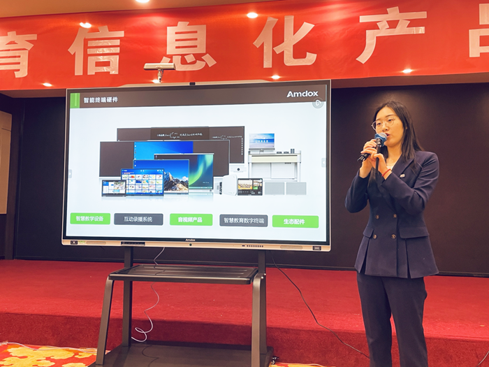 安道教育講師韓夢思通過產品講解和案例展示,向參會人員展示了安道新的全場景智慧教室解決方案和應用場景。