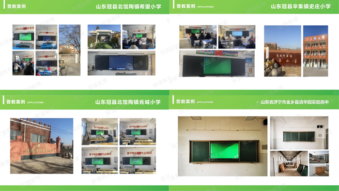 如今,安道教育在魯豫地區擁有許多的落地案例。例如:山東濟寧市金鄉縣清華園實驗高中的智慧黑板項目、山東臨沂馬廠湖小學的校園班級文化建設方案、山東冠縣北館陶鎮肖城小學/斜店中心小學/辛集鎮史莊小學的智慧黑板項目等。這些案例,充分展現了安道教育超強的行業競爭力和卓越的交付能力。