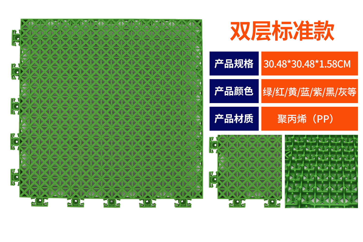 雙層米字棱形鏤空面層,雙層結構使產品的物理性能加強,在長時間的戶外鋪裝中,雙層地板的 場地變形基數遠低于單面層地板。