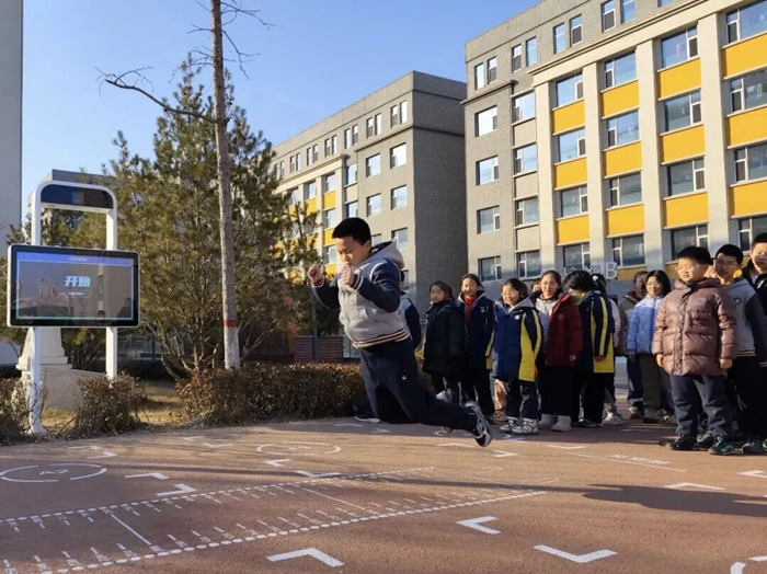 走進(jìn)新學(xué)道的AI智慧操場(chǎng),最吸睛的莫過于那臺(tái)體育教學(xué)屏。一臺(tái)設(shè)備集成立定跳遠(yuǎn)、跳繩等多個(gè)運(yùn)動(dòng)項(xiàng)目,不僅能實(shí)時(shí)捕捉運(yùn)動(dòng)成績(jī),更能精準(zhǔn)分析起跳角度、擺臂幅度等細(xì)節(jié)數(shù)據(jù),連踩線等細(xì)微違規(guī)動(dòng)作也逃不過它的“眼睛”。