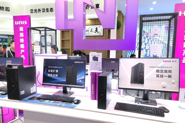 在紫光計算機展位,重點展示了搭載全新英特爾®酷睿™桌面處理器(第14代)的商用臺式機UltiDesk 500 G2系列;擁有雙NVMe M.2 SSD接口+雙DDR5內存插槽的商用輕薄筆記本UItiBook Pro 14 G2;采用國產化處理器的商用臺式機UNIS D3890 G2(兆芯KX-U6780A八核處理器)、UNIS D3830 G3(海光3350八核處理器)、UNIS D3811 G2(飛騰D2000八核處理器)、商用筆記本UNIS L3891 G3(兆芯KX-6000G四核處理器)、UNIS L3813 G2(飛騰D2000八核處理器)。此外,新一代商用顯示器、桌面生態配件及相關配套產品也悉數展出。